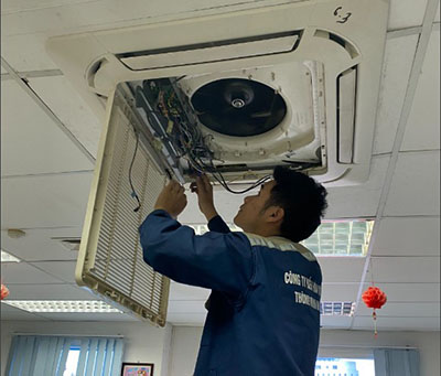 Kỹ thuật viên thực hiện bảo dưỡng hệ thống điều hòa