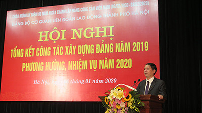 Phát biểu chỉ đạo hội nghị, đồng chí Nguyễn Đức Thành – Phó Bí thư Đảng ủy Khối các cơ quan Thành phố đã đồng tình và ghi nhận những kết quả mà Đảng bộ Cơ quan LĐLĐ Thành phố đã nỗ lực phấn đấu đạt được trong năm 2019. Đồng chí khẳng định, trong năm 2019, Đảng bộ cơ quan bám sát sự lãnh đạo của Đảng ủy Khối, có nhiều đổi mới, chủ động trong công tác lãnh đạo các chi, đảng bộ bộ phận thực hiện đạt kết quả toàn diện trong công tác xây dựng Đảng; vừa hoàn thành xuất sắc công tác chuyên môn vừa tích cực tham gia xây dựng Đảng bộ trong sạch, vững mạnh, thường xuyên duy trì sinh hoạt và đổi mới sinh hoạt theo hướng chuyên đề... Đồng chí Nguyễn Đức Thành cũng đồng tình với 12 nhiệm vụ trọng tâm năm 2020 đã đề ra trong báo cáo và nhấn mạnh thêm một số nội dung để Đảng bộ Cơ quan LĐLĐ Thành phố nghiên cứu