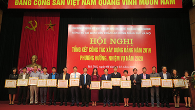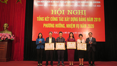 Đồng chí Nguyễn Đức Thành - Phó Bí thư Đảng ủy Khối các cơ quan Thành phố và đồng chí Đặng Thị Phương Hoa - Phó Chủ tịch Thường trực phụ trách LĐLĐ Thành phố trao Bằng khen cho 4 chi bộ xuất sắc năm 2019
