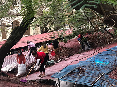 Hình ảnh đoàn viên đang quét và thu gom lá rụng trên mái nhà xe Toà nhà Kinh Đô