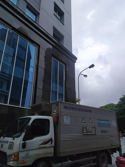 Xe của Công ty môi trường đến thu gom rác thải nguy hại tại Tòa nhà Kinh Đô