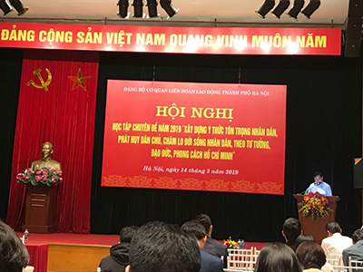 Sáng ngày 14/3/2019, Đảng bộ cơ quan LĐLĐ Thành phố Hà Nội tổ chức Hội nghị nghiên cứu, học tập chuyên đề năm 2019 “Xây dựng ý thức tôn trọng nhân dân, phát huy dân chủ, chăm lo đời sống nhân dân theo tư tưởng, đạo đức, phong cách Hồ Chí Minh” cho toàn thể các đồng chí Đảng viên, cựu chiến binh thuộc Đảng bộ cơ quan LĐLĐ Thành phố Hà Nội