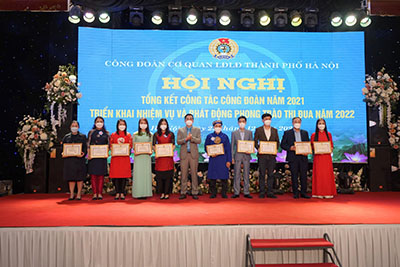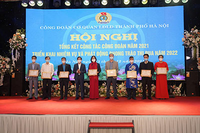 Chiều 23/12, tại Cung Văn hóa Lao động hữu nghị Việt Xô, Công đoàn Cơ quan LĐLĐ thành phố Hà Nội đã tổ chức hội nghị tổng kết công tác công đoàn năm 2021, triển khai nhiệm vụ, phát động phong trào thi đua năm 2022 và tổ chức chương trình Tết Sum vầy – Xuân bình an năm 2022.