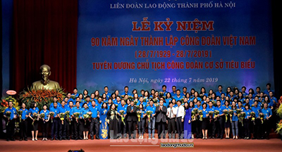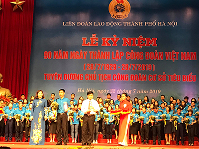 Trong không khí thi đua lập thành tích chào mừng 90 năm Công đoàn Việt Nam của đoàn viên, CNVCLĐ cả nước, sáng nay (22/7), tại Cung Văn hóa Lao động Hữu nghị Việt Xô, LĐLĐ Thành phố Hà Nội trang trọng tổ chức Lễ kỷ niệm 90 năm Ngày thành lập Công đoàn Việt Nam (28/7/1929 – 28/7 2019) và tuyên dương 90 Chủ tịch Công đoàn cơ sở tiêu biểu.