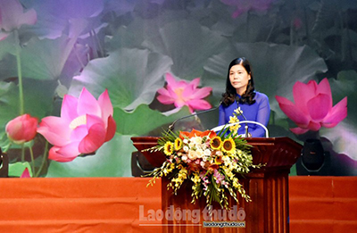 Thay mặt lãnh đạo LĐLĐ Thành phố, đồng chí Đặng Thị Phương Hoa - Phó Chủ tịch thường trực phụ trách LĐLĐ Thành phố Hà Nội đọc diễn văn ôn lại truyền thống 90 năm vẻ vang của tổ chức Công đoàn Việt Nam.