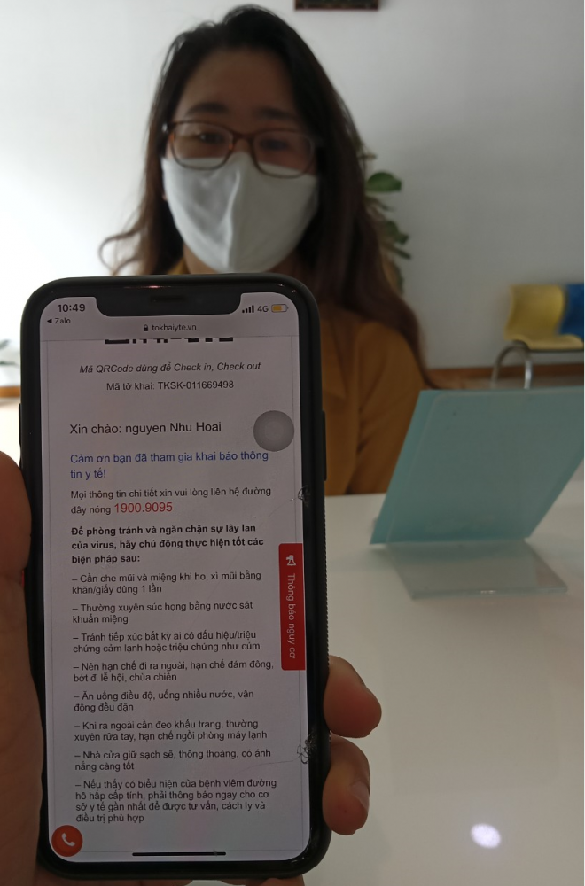 Song song với việc khai báo ý tế bằng giấy, Đơn vị Tòa nhà đã tạo mã QR để phục vụ khách hàng thực hiện khai báo y tế bằng điện thoại cá nhân. Khách hàng sau khi dùng điện thoại quét mã QR tại quầy lễ tân tầng 1 và tầng 6 của Tòa nhà sẽ hiện lên tờ khai điện tử, khách khai báo xong sẽ gửi ảnh tờ khai của mình cho Tòa nhà và Tòa nhà sẽ lưu lại trong nhóm zalo Đơn vị.