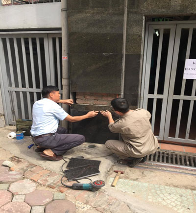 Cán bộ Công nhân viên Tổ kỹ thuật Tòa nhà sửa chữa đá ốp tường bị rạn nứt